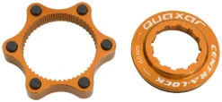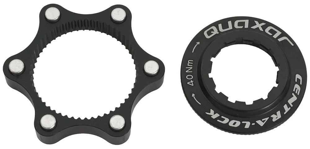 Die CNC-gefrästen und eloxierten Quaxar Centerlock Adapter wurden entwickelt, um eine 6-Loch Bremsscheibe auf einer Centerlock-Nabe montieren zu können.