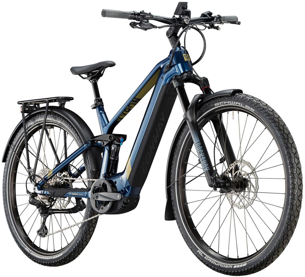 Das Conway Xyron SUV 6.9 ist das wohl bequemste und dennoch alltagstauglichste E-MTB. Ausgestattet mit Licht, Gepäckträger und Schutzblechen vereint es den Komfort eines E-Fullys mit der Praktikabilität eines urbanen Bikes. Es überzeugt mit einem leistungsstarken Bosch Performance CX Gen 4 Motor. Der 750 Wh große Akku versorgt dich zuverlässig mit dem nötigen Strom, damit du noch länger die Zeit auf deinem Bike genießen kannst.