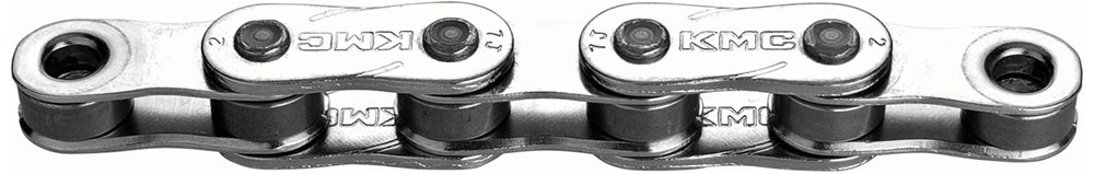 Die Z1eHX Wide Singlespeedkette von KMC mit einer vernickelter Oberfläsche für BMX, Nabenschaltungssystem und andere Single-Speed-Systeme, die eine direkte Kraftübertragung benötigen.