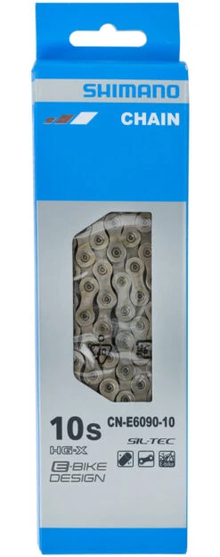 Die CN-E6090 10-fach E-Bike Kette von Shimano mit SIL-TEC Oberflächenbeschichtung und neuer Kettengliedgröße für STEPS E6000 und E8000 1 x 10-fach Antrieb System.
