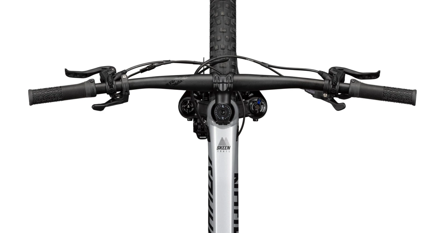 An der Front verbauen wir eine komfortable RockShox Pike Select Federabel, die 130mm Federweg zur VerfĂĽgung stellt und mit ihren 35mm Standrohren eine hohe Steifigkeit aufweist, damit Du auch immer dahin fährst, wo Du hin willst. FĂĽr den kompletten TrailspaĂź arbeitet am Heck der passende Deluxe Select+ Dämpfer, ebenfalls aus dem Hause RockShox. Er generiert 120mm sensiblen Federwegs, der sportlich-straff fĂĽr effizienten Vortrieb sorgt, Dir aber auch Reserven in der Abfahrt bietet. Wenn Du dort in den Geschwindigkeitsrausch kommst, bremst Dich die starke Magura MT Thirty mit vier Kolben vorne kraftvoll und dosiert wieder ein. Mit der Shimano SLX 12-fach Schaltung bist Du präpariert fĂĽr epische Touren, dank der Kassette mit enormer Bandbreite von 10-51 Zähnen wird jeder Anstieg zum reinsten VergnĂĽgen und auch fĂĽr die Abfahrt sind die passenden Ăśbersetzungen parat. Der solide SUNringlĂ© DĂĽroc 35 Laufradsatz begleitet Dich auf vielen Trail – Kilometern und nimmt mit seiner groĂźen Maulweite Schwalbe’s Kultreifen Nobby Nic perfekt auf. Diese rollen gut und bieten mit der ausgefeilten Anordnung der Stollen viel Grip im raueren Gelände. Dort hast Du noch zwei weitere Asse im Ă„rmel: das ergonomische RaceFace Ride Cockpit verleiht dir maximale Kontrolle und die vom Lenker aus absenkbare Radon VariostĂĽtze hilft Dir, Dein Gewicht im steilen Gelände weit nach hinten zu verlagern. Bis bald im Wald mit SKEEN TRAIL AL 7.0!